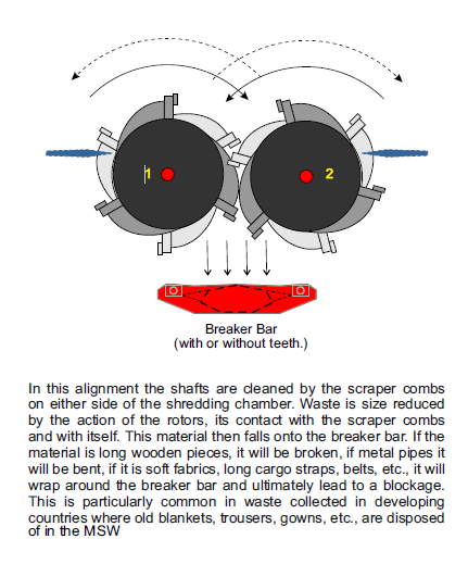 In some cases, the breaker bar has sharpened steel teeth added to help with opening bags, these teeth do work when the shredder first starts operating after cleaning, but again, because of fabrics in the matrix, they quickly become wrapped in materials and in operational terms all they do is increase the surface area of the breaker bar resulting in more blockages.