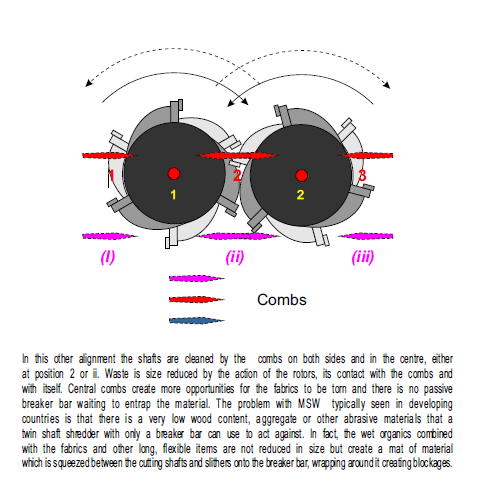 A quick solution to this problem is to remove the breaker bar (which has no role in the cutting and shredding of the MSW as it is at least 200mm below the shafts, and is designed to break long pieces of wood, plastic, etc. That’s why it’s called a breaker bar.) The consequence of removing this breaker bar has been reported as increasing the volume of heavy discharge at the density separation stage, but that is at present only anecdotal. A better solution would be to have a smaller cutting size and either a central scraper comb in addition to the two side scraper combs or, to have a sizing screen below the shafts. Ultimately that means you aren’t going to get whole PET bottles or metal cans, but the good stuff is gone, anyway…